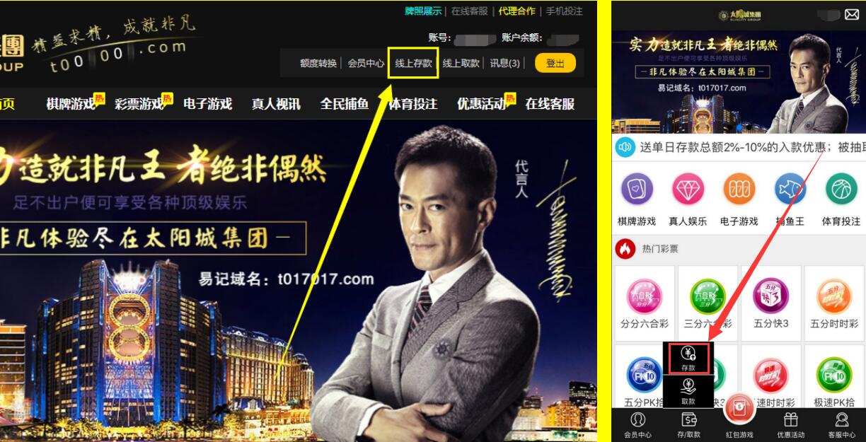 手机用户:登入您的会员账号, 点击【存/取款--存款】