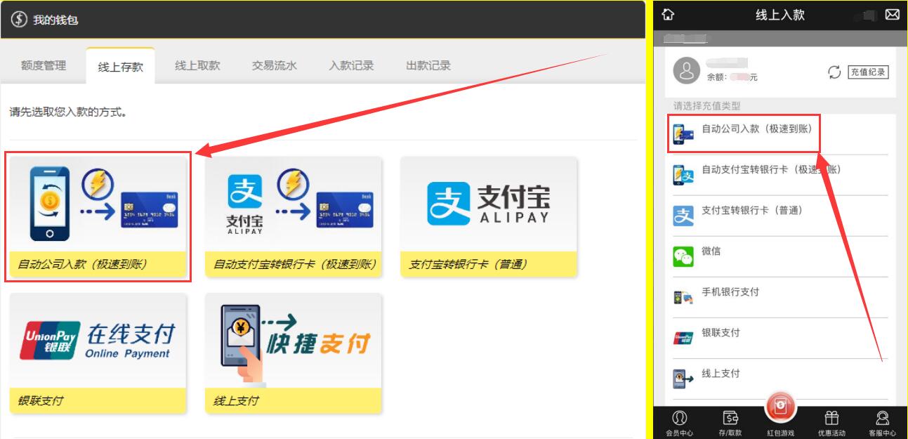 电脑/手机用户:进入线上存款页面,点击自动公司入款(极速到账)。