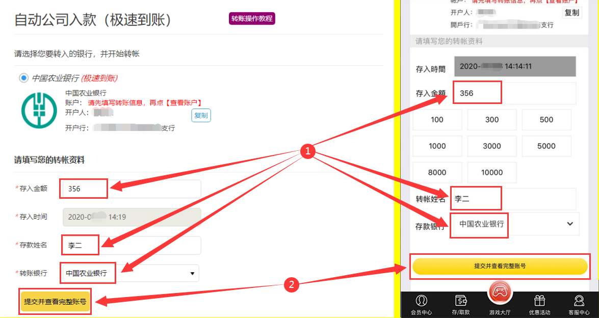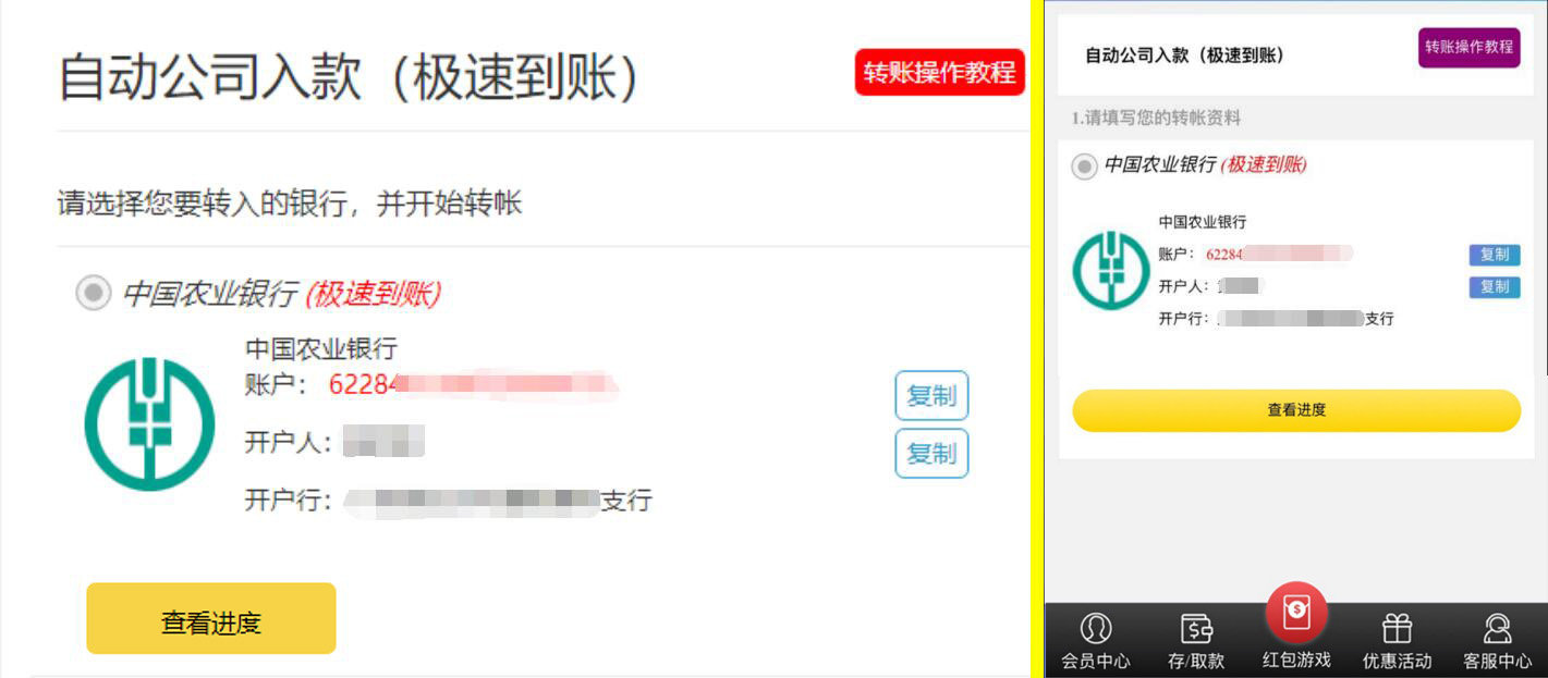 电脑/手机用户:查看并记录好公司的【入款卡号、开户人姓名、开户行等信息】→在一小时内使用【手机银行、网银等转账工具】对我司银行卡转账,转账时【请务必转入填写的存款金额】以便系统尽快核实您的款项并为您添加额度。(成功转账后,可通过查看进度,查看您的额度是否添加。)